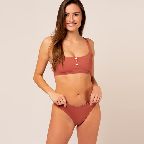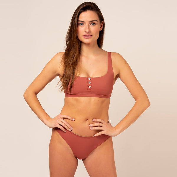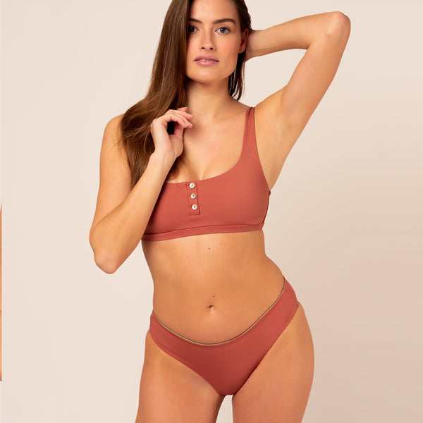 It's great to hear that this bikini top is not only stylish but also sustainable. Wide straps and a scoop neckline can provide comfort and support, making it suitable for various water activities. The button bar adds a unique touch to the design and can enhance the overall look of the bikini top.