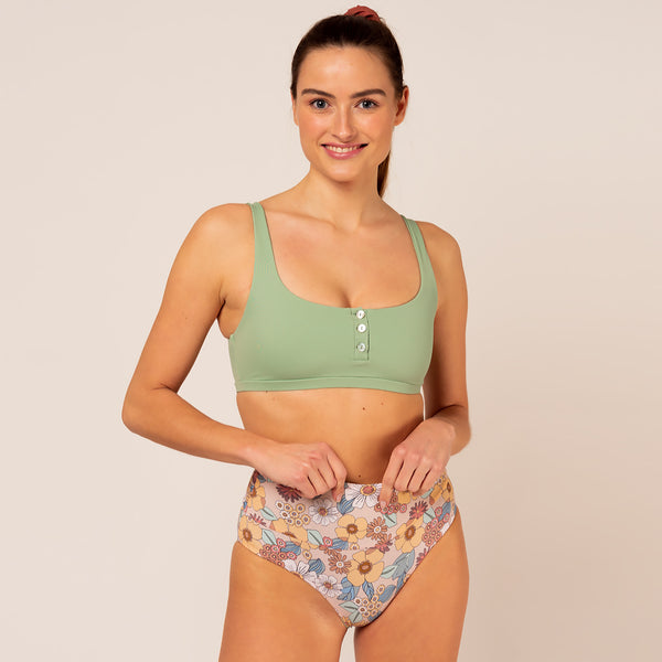 It's great to hear that this bikini top is not only stylish but also sustainable. Wide straps and a scoop neckline can provide comfort and support, making it suitable for various water activities. The button bar adds a unique touch to the design and can enhance the overall look of the bikini top.